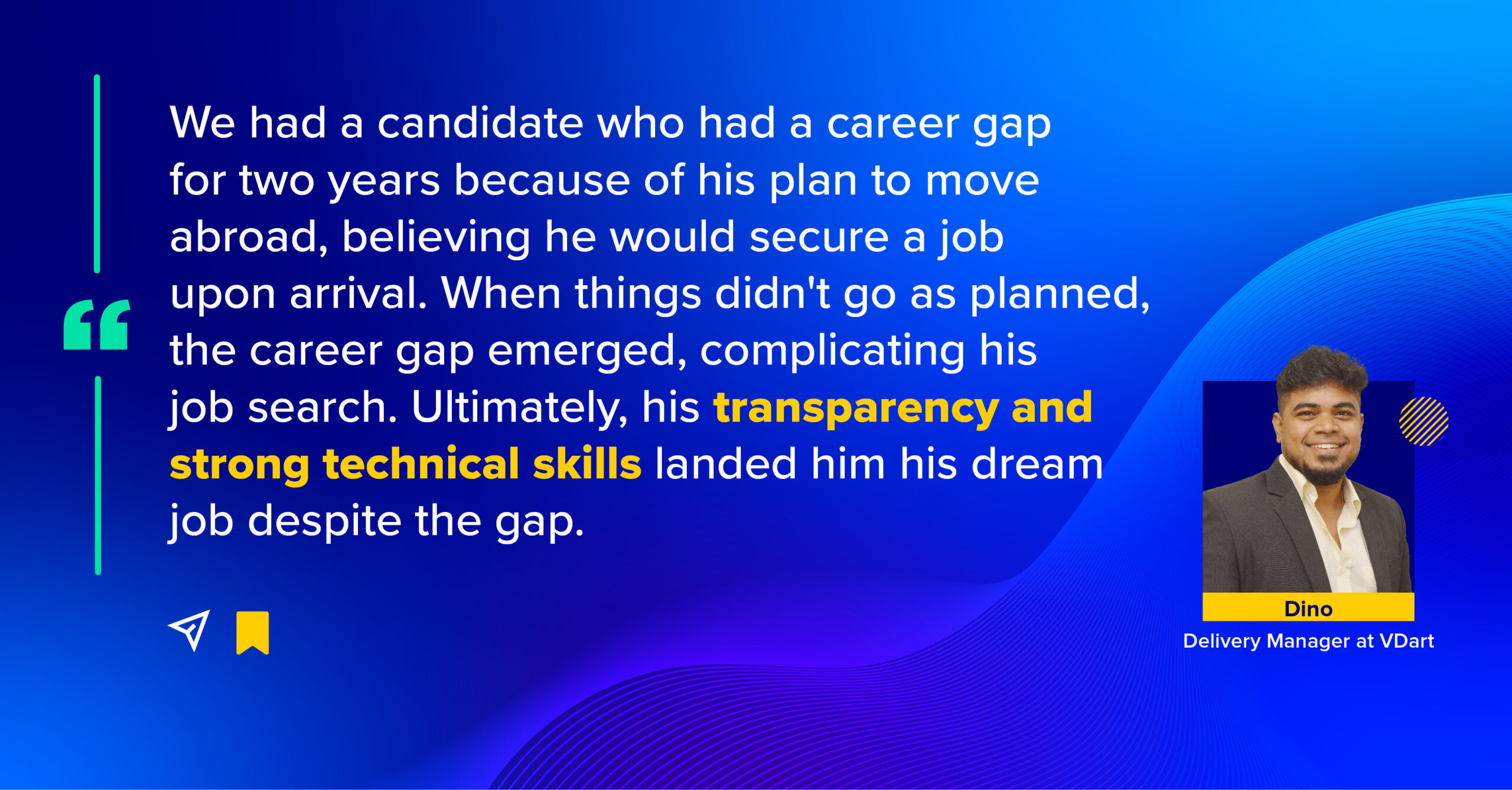 “We had a candidate who had a career gap for two years because of his plan to move abroad, believing he would secure a job upon arrival. When things didn’t go as planned, the career gap emerged, complicating his job search,” shared Dino, the Delivery Manager at VDart. “Unless you’re sure about your work visa or have strong confidence in your decision, taking such a risk is not advisable.” he also advised. “Despite this situation, we were able to onboard him because he was technically strong and transparent with the employers,” he added.