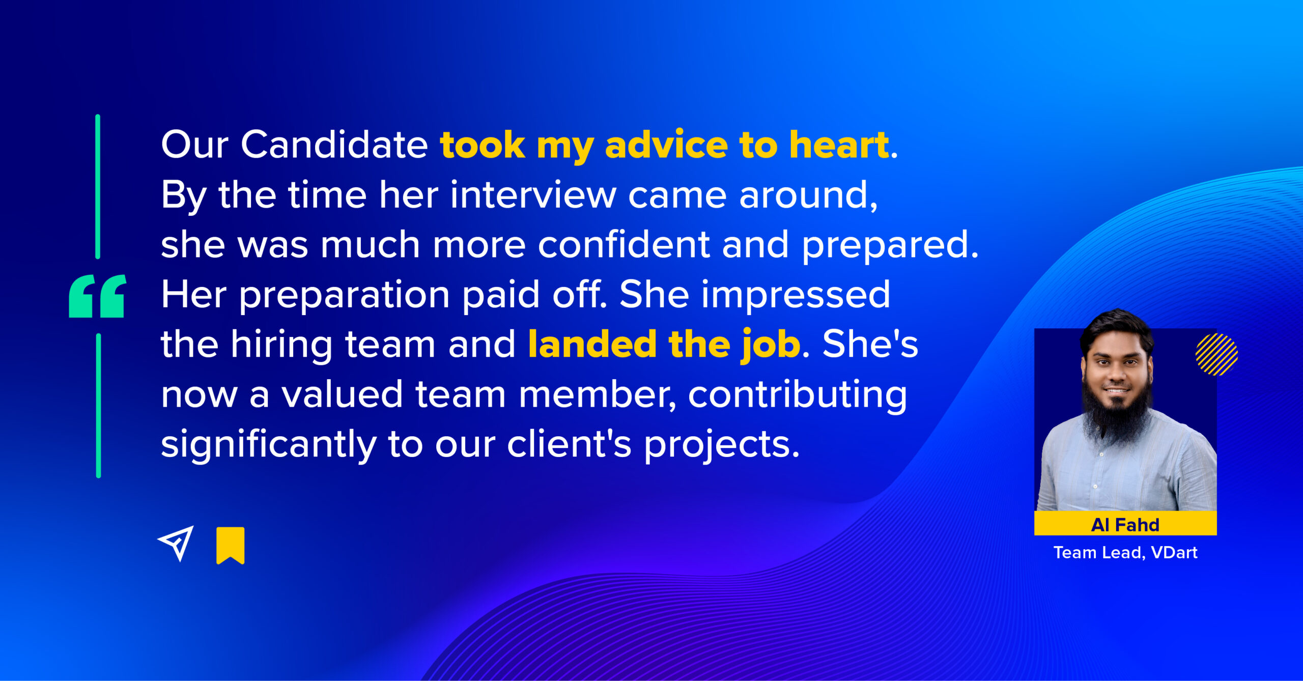 Bhagya took my advice to heart. By the time her interview came around, she was much more confident and prepared. Her preparation paid off. Bhagya impressed the hiring team and landed the job. She’s now a valued team member, contributing significantly to our client’s projects.”
